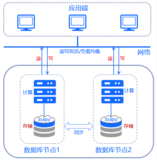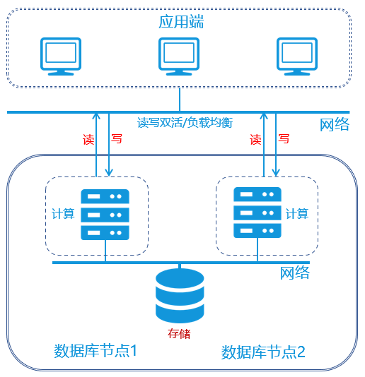 两台数据库节点互相通信,互相检测心跳,出现单一节点宕机时对应用无直接影响,应用可正常与数据库进行交互,具备较强的高可用能力、高容灾能力;如需要对数据库服务器进行维护,需要停止某一点数据库服务或重新启动操作系统时,另外一个节点继续对应用提供数据服务,维护完成后重新启动该节点的数据库服务则自动加入到集群中。