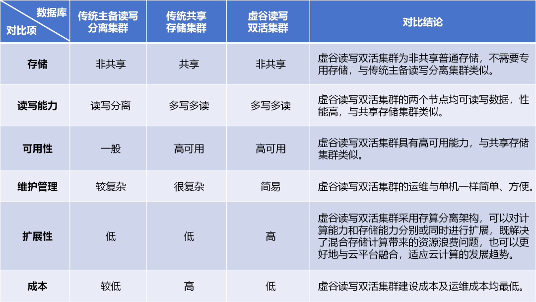 我们从以下几个方面对传统主备读写分离集群、传统共享存储集群与虚谷读写双活集群进行总结: