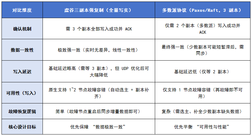 多数派协议(以 3 副本为例)是分布式数据库的 “通用方案”,其核心逻辑是 “超过半数副本确认即成功”,与虚谷三副本强复制形成鲜明对比。两者的差异并非 “优劣之分”,而是 “场景适配之别”。
